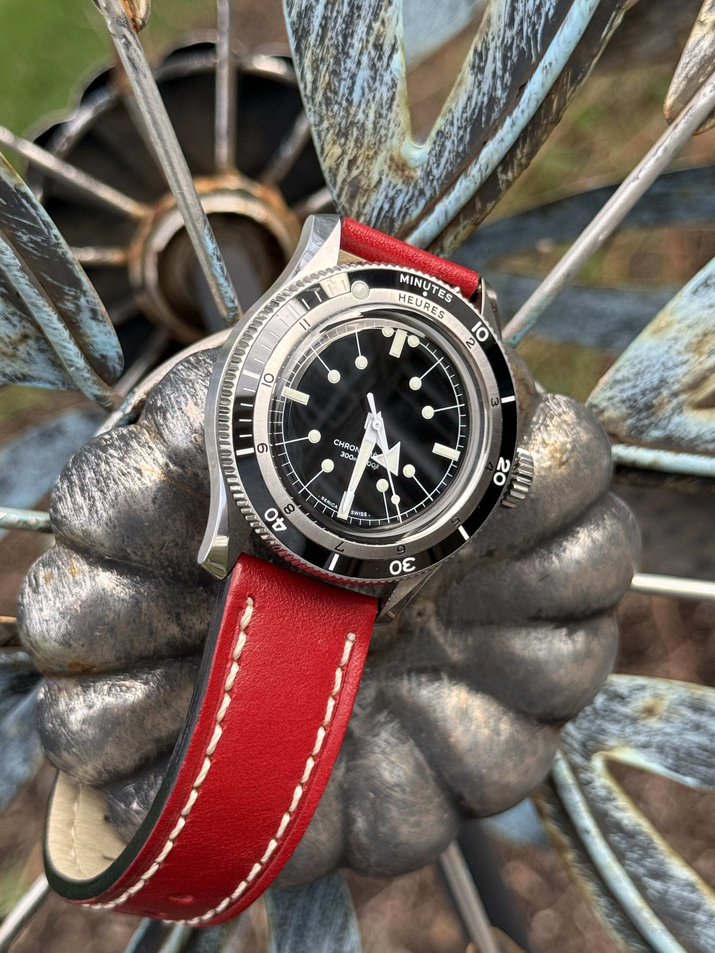 The watch ipicks up even more personality on that red Condor strap. Purists may prefer the stock woven steel bracelet, and Serica’s mesh does look excellent on the official watch. Still, I the red strap proves something important about the 5303: it does not need to stay in one lane. On mesh, it leans more marine and more period-correct. On the red leather, it loosens up and starts acting like a design object as much as a tool watch. That versatility tracks with Serica’s own pitch for the model as something suited to elegant and demanding routines alike.